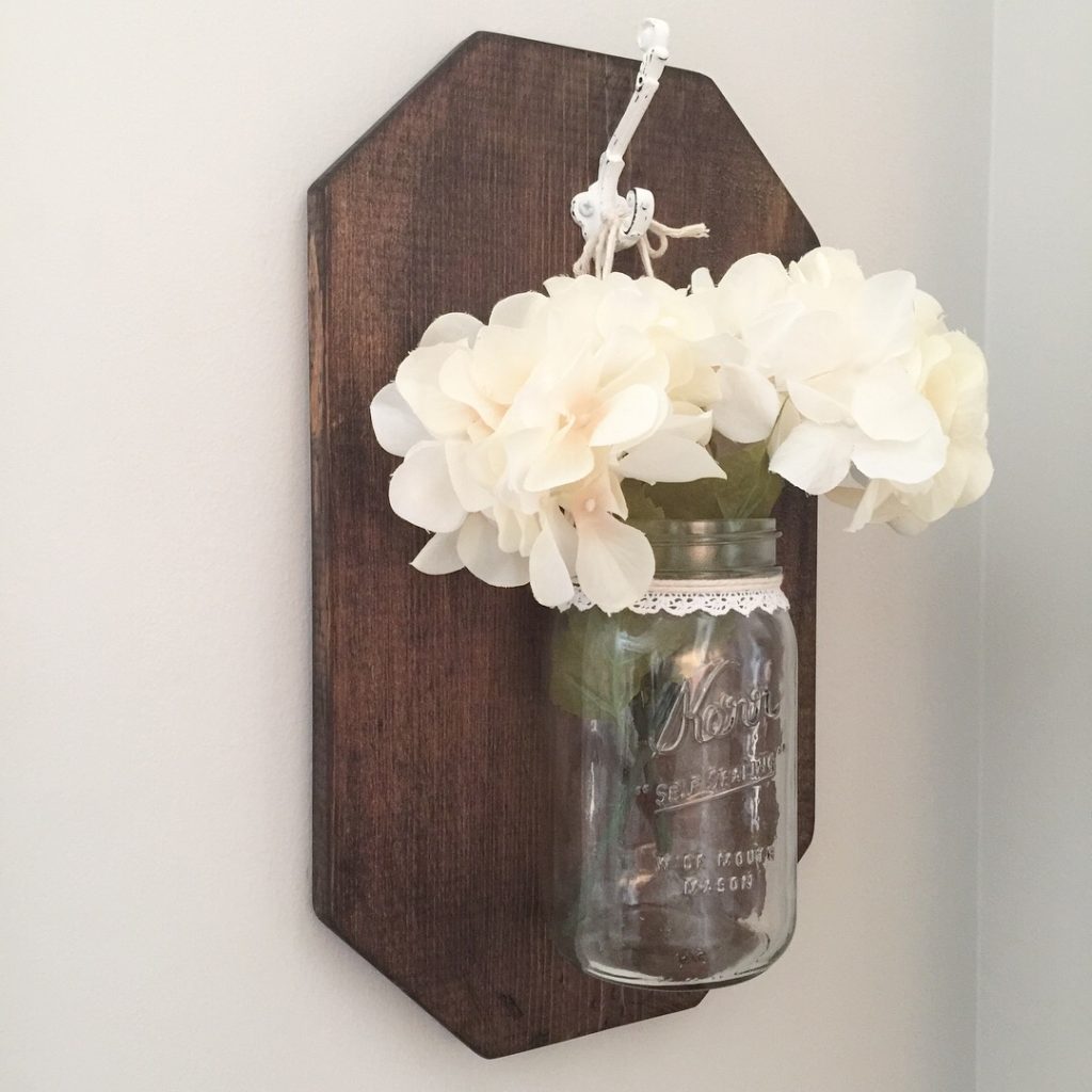 Next, once your stain has dried, screw in the decorative hooks to each board. Then, decorate your mason jars however you would like. We opted to tie some decorative ribbon round the rim. If you want, you could use chalk paint to paint your jars and then scuff them up a little. When you’re done decorating, wrap some twine around the neck of the bottle and tie securely to the hook. I’m not a twine tying expert, so I left that task to Helen.