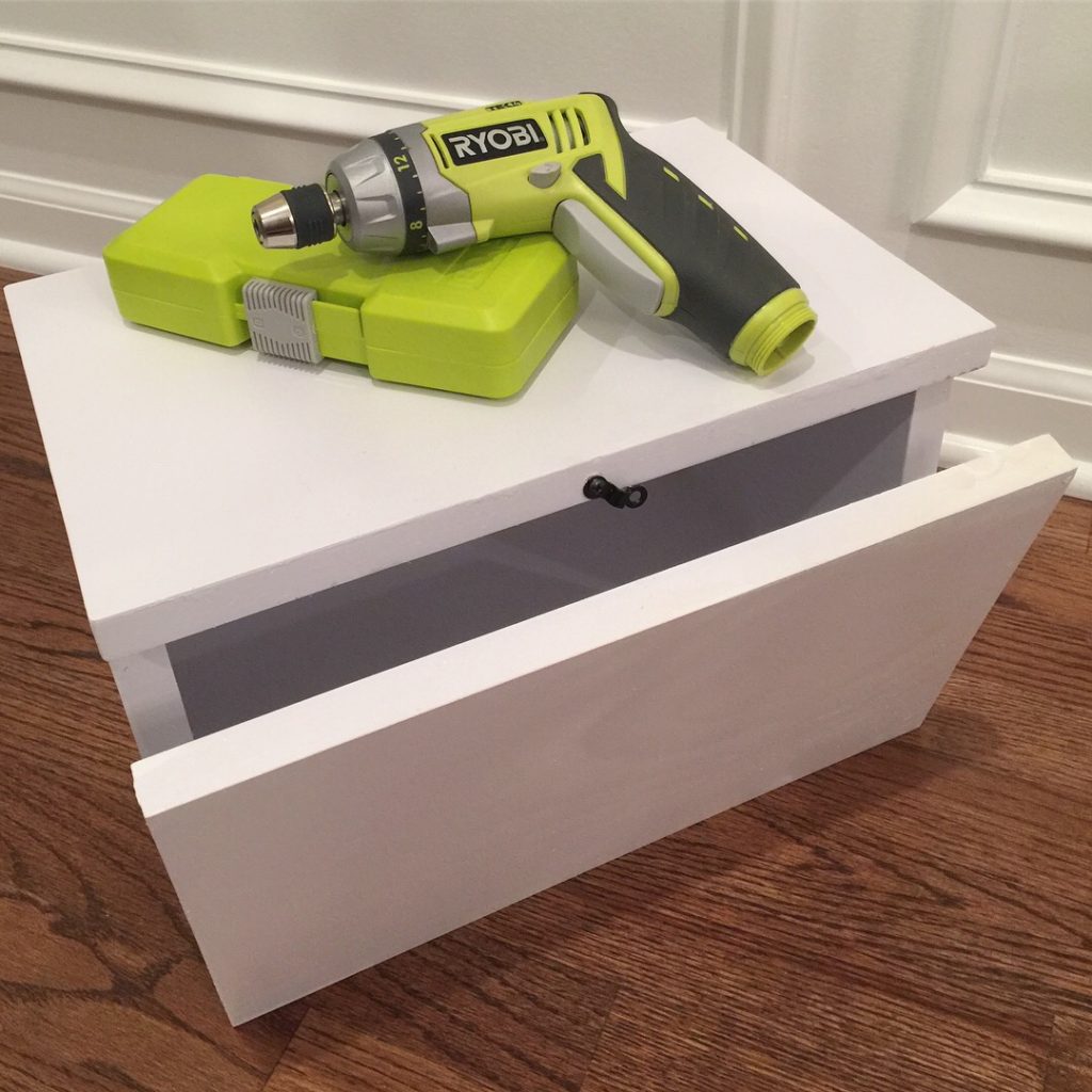 For the most part, I followed Jenn’s plans with the exception of the following. First, I was too impatient and didn’t end up using wood glue. I just focused on using more brad nails in appropriate areas. Ultimately, the end product still feels pretty solid and without any noticeable gaps even without the wood glue. I found my hinges at Menards, which were about $4.10. Once the build was complete, I sanded down the box, filled in the nail holes, applied just a touch of caulk to a few areas, and applied some Zinsser Primer to the wood. I applied the primer in order to avoid splotchy areas and to get a smooth look when I spray painted the entire box white.
