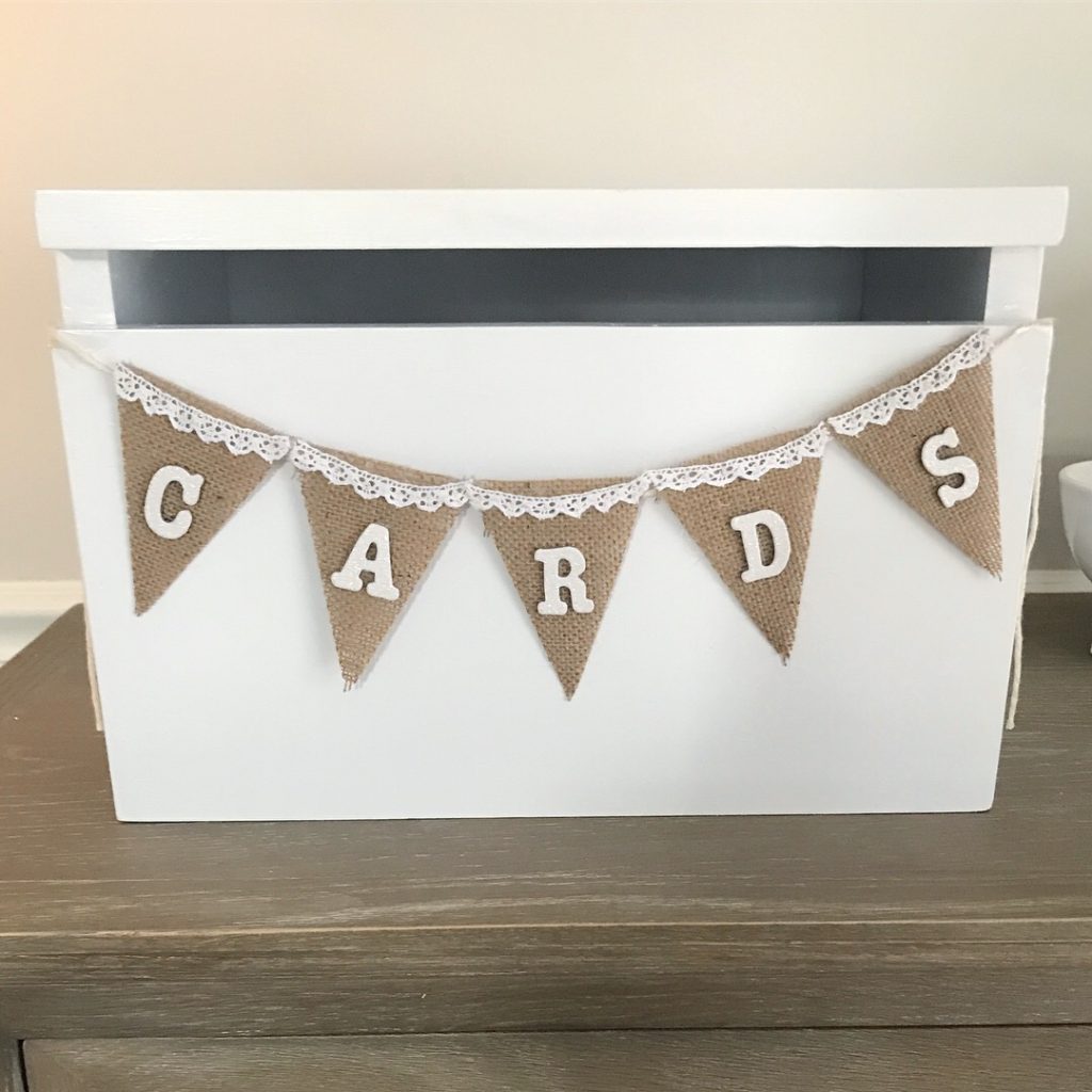 Finally, Helen opted to decorate the front of the easy DIY card box with a banner and stick on letters that she scored from Michaels (see pic above). We simply taped the banner up with string and voila! Easy DIY card box complete! “Feed me loving words, cards, and money, money, money!” said the easy DIY card box. j/k… not really…seriously, cash is the best wedding gift people…